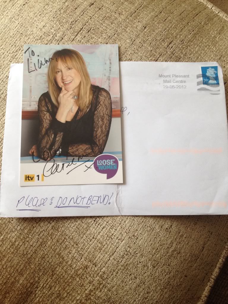 Carol McGiffin failure but great success - December 5th, 2013 I sent a letter and SAE to Carol on: 27th November 2013, asking if she recieved the chocolates I sent her, and today I recieved this signed photo back and on the back, she said that she didnt recieve them, but thankyou anyway. Slightly disappointing she didnt get them. but still happy with this success.