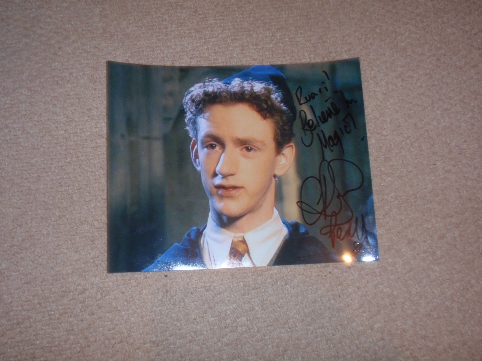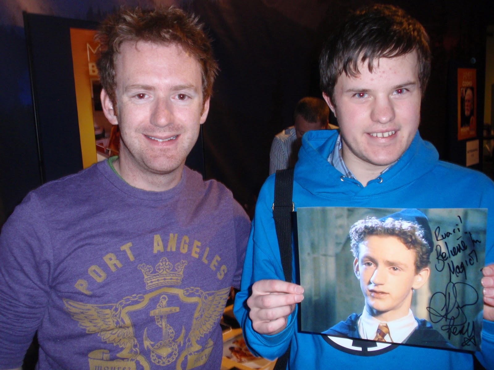 On February 16th I attended the convention known as Heroes & Legends, which took place in Belfast, Northern Ireland. This was the second year this event had been held, with the first time being last year (2012), but I didn't know about it, and there wasn't really a focus on Harry Potter at the first event. No Harry Potter celebrities, and only one cos-player cos-playing as Minerva McGonagall with a sorting hat set, where you could be sorted into your very own house. At this years event, there was a much larger focus on Harry Potter. Two celebrities (would've been three but one of them had to pull out), and one only had one Harry Potter picture (set aside just for me), and several cos-players this time (McGonagall was back, but accompanied by Severus Snape, Professor Quirrel, Bellatrix Lestrange and two masked Death Eaters), but I was only really interested in the celebrities, especially Chris Rankin (Percy Weasley). Chris was a really nice and funny guy, and you could tell a lot of the fan-girls at the event were there just for him (especially evident in the Actors Q&A, the only questions the other two actors in the Q&A got to answer were questions aimed at the group, and those directed just at Chris were all from girls). Not saying that's a bad thing, mind you. It was quite amusing to watch, actually. Unlike the other celebrity I met at the event (Ian Whyte), Chris had a wide selection (up to seven-nine I think) pictures to choose from Harry Potter. Even though I would've preferred one from the later films, I decided to go for one just of Percy, rather than one with multiple characters in the picture. My Dad and I were discussing at the table which ones were the best and which weren't in our minds, and while Chris was turned around talking to a James Bond actress beside him, we could tell he was actually listening to our conversation, which was made event when after a minute or two he turned around and joked, "Choices, choices!", which was pretty amusing. If you're not sure, my autograph reads, "Ruari! Believe in Magic, Chris Rankin, Percy, Weasley (at least, I presume Weasley is at the bottom, I don't know what else it could be). Chris also told lots of tales during the Actors Q&A, such as how he mainly works behind the camera now, giving orders to extra's and was telling us all sorts of orders he has to give to them. Also amusing was, after my Dad had taken the picture above with myself and Chris, Chris asked to see the picture himself and his only comment was, "My eyes." For those who can't tell, my camera does make peoples eyes look a tad red.